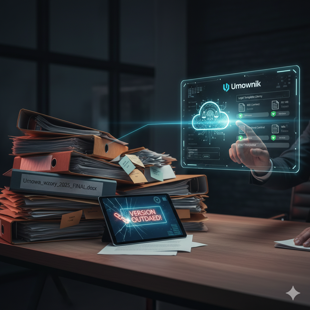 Większość mikro i małych firm trzyma swoje wzory umów w nieuporządkowanych folderach na Google Drive lub Dropboxie. Pliki o nazwach typu „Umowa_v12_FINAL_2025_poprawki_Marek.docx” to tykająca bomba zegarowa. W 2026 roku korzystanie ze statycznych wzorów Word to technologia z poprzedniej epoki.